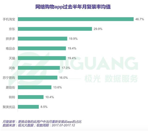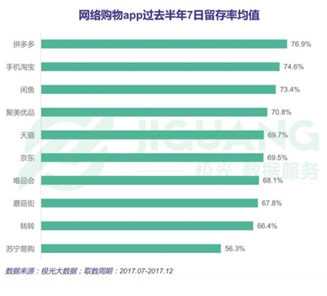 根據極光大數據的調查顯示,2017年下半年,拼多多的7日留存率均值76.9%,處于行業(yè)領先地位,但其月復裝率19.9%,較淘寶的46.7%差距較大,同樣落后于京東的29.9%。