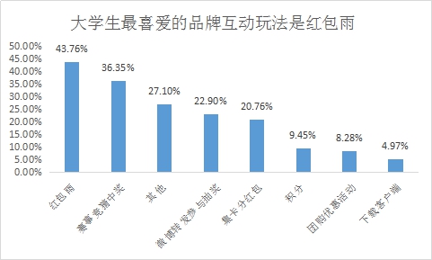 在世界杯期間,各品牌采取了多種多樣的互動(dòng)玩法吸引消費(fèi)者進(jìn)行溝通,43.76%的受訪者最喜歡參與的是紅包雨,其次是參與賽事競猜有機(jī)會(huì)中獎(jiǎng),約占36.35%,積分、團(tuán)購優(yōu)惠和下載客戶端等互動(dòng)方式對大學(xué)生的吸引力較低。