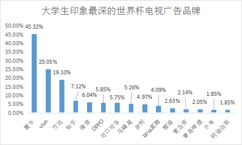 在提到世界杯期間印象最深的電視廣告品牌時(shí),45.32%的受訪者表示對蒙牛投放的世界杯廣告印象最深,其次是vivo,約占25.05%。在受訪者廣告印象最深的前14個(gè)品牌名單中,包括蒙牛、vivo、萬達(dá)、海信、可口可樂、雅迪、麥當(dāng)勞和阿迪達(dá)斯等7家FIFA官方贊助商,以及知乎、OPPO、馬蜂窩、伊利、boss直聘、青島啤酒、小米等7家中央電視臺(tái)賽事轉(zhuǎn)播合作伙伴和贊助商。