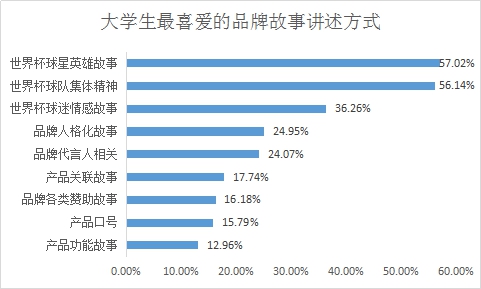 品牌營銷的關(guān)鍵在于講好品牌故事。在各種各樣的世界杯廣告的品牌故事創(chuàng)意講述方式中,受訪者最認(rèn)可的方式是講述世界杯球星英雄故事和世界杯球隊(duì)集體精神,二者分別占57.02%和56.14%,另外在品牌廣告創(chuàng)意中采用講述球迷情感故事的方式也得到了相當(dāng)規(guī)模的認(rèn)同,約占36.26%。