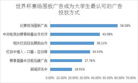中國品牌在2018世界杯期間的廣告投放與營銷形式多種多樣,其中大學(xué)生最認(rèn)可的廣告投放方式為在比賽現(xiàn)場投放圍板廣告,約占58.58%,其次43.08%的受訪者認(rèn)同品牌通過成為中央電視臺(tái)賽事轉(zhuǎn)播合作伙伴的方式投放廣告,受訪者最不認(rèn)可的廣告投放方式為在新聞資訊中投放廣告,約占18.91%。