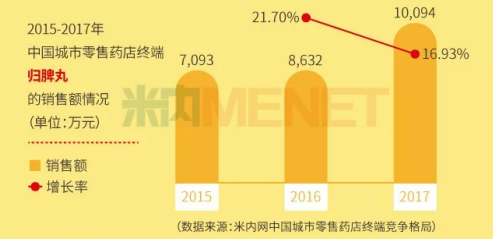 其中,歸脾丸為補(bǔ)血用藥,2016—2017年在中國城市零售藥店的銷 售增速均超過10%,2017年銷 售額順利突破億元。該產(chǎn)品的競爭企業(yè)超過200家,領(lǐng)軍企業(yè)為仲景宛西制藥,仲景牌歸脾丸市場份額接近50%。(數(shù)據(jù)來自米內(nèi)網(wǎng))
