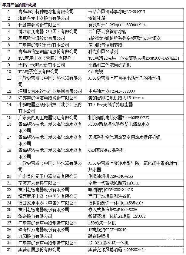 “中國(guó)家用電器創(chuàng)新成果推介”活動(dòng)持續(xù)火爆,今年也同樣吸引了大量企業(yè)參與,(以下按照字母順序排列)安吉爾、奧克斯、奧馬、奧普、A.O.史密斯、巴慕達(dá)、比佛利、博世、長(zhǎng)虹、戴森、大松、方太、格力、海爾、華帝、海信、九陽、卡薩帝、科龍、老板、美的、美菱、歐意、容聲、TCL、統(tǒng)帥、小狗、西門子家電、夏普、小天鵝等家電品牌成為中國(guó)家電行業(yè)的創(chuàng)新標(biāo)桿。