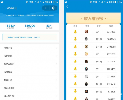張琳隨即給我們展示了“繪贏智能名片”的核心分銷模塊,其模塊設(shè)計出發(fā)點就是不僅可以做到自用輕松拓客,還能做到分享輕松賺錢。名片訪客A通過自己的名片創(chuàng)建名片,自己立得支付金額31%的傭金;名片訪客B通過A用戶的名片創(chuàng)建名片,自己又立得B用戶支付金額31%的傭金。以A直接邀請100位B計算,這100位B又各自邀請100位C,輕松可賺到近31萬元。如果升級成為銀牌合作商,傭金更高,輕松賺百萬,升級成金牌合作商,深度裂變、多層發(fā)展,幾個月賺幾百萬很正常,目前在系統(tǒng)排行榜上,做的最好的一位金牌合作商,之前工作是資深保險經(jīng)紀(jì)人,最近幾個月專職做繪贏智能名片,已經(jīng)入賬300多萬了,而且收入還在繼續(xù)增長。因為名片是剛性需求,市場龐大,未來大有可為。