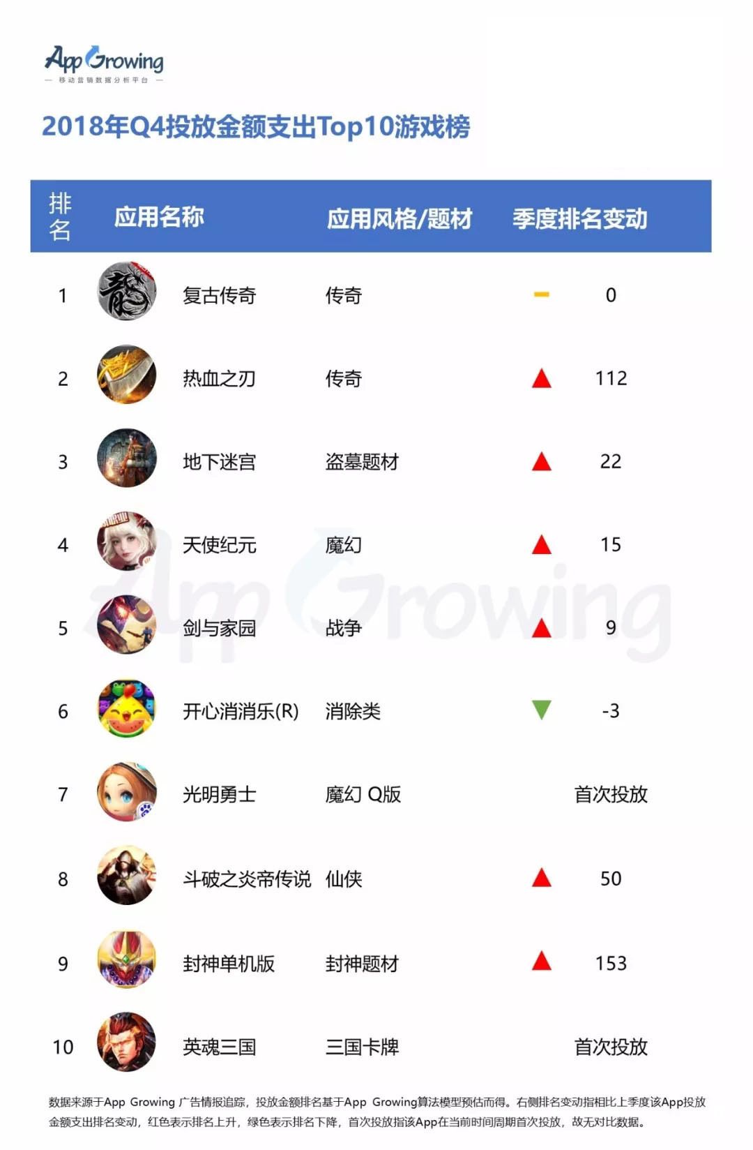 傳奇類手游 《復(fù)古傳奇》《熱血之刃》分列 2018年 Q4 投放金額支出Top10游戲榜第一及第二,其中《復(fù)古傳奇》 已連續(xù)兩個季度位列投放金額支出榜首。在Top10 排行榜中,《光明勇士》《英魂三國》在 Q4 期間為首次投放。