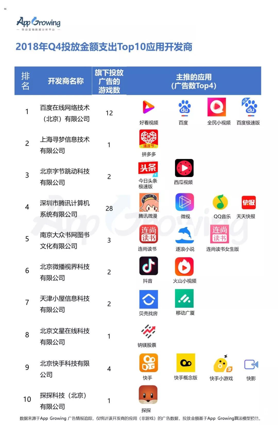 2)2018年Q4 投放金額支出Top10應(yīng)用開發(fā)商