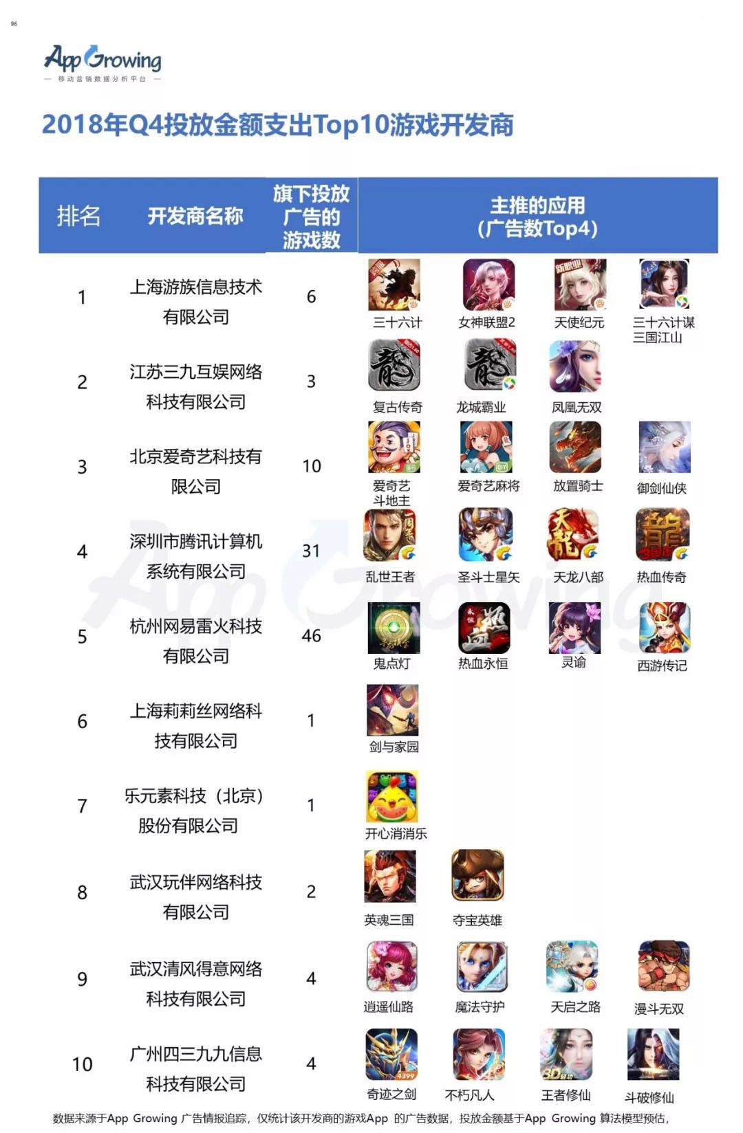 上海游族信息技術(shù)有限公司位列2018年Q4 投放金額游戲開發(fā)商榜榜首,旗下共有6款游戲在期間有投放廣告,《三十六計》、《女神聯(lián)盟2》、《天使紀(jì)元》為其持續(xù)主推游戲。而 北京愛奇藝科技有限公司則緊隨其后,棋牌類游戲《愛奇藝斗地主》《愛奇藝麻將》為其重點推廣的游戲。