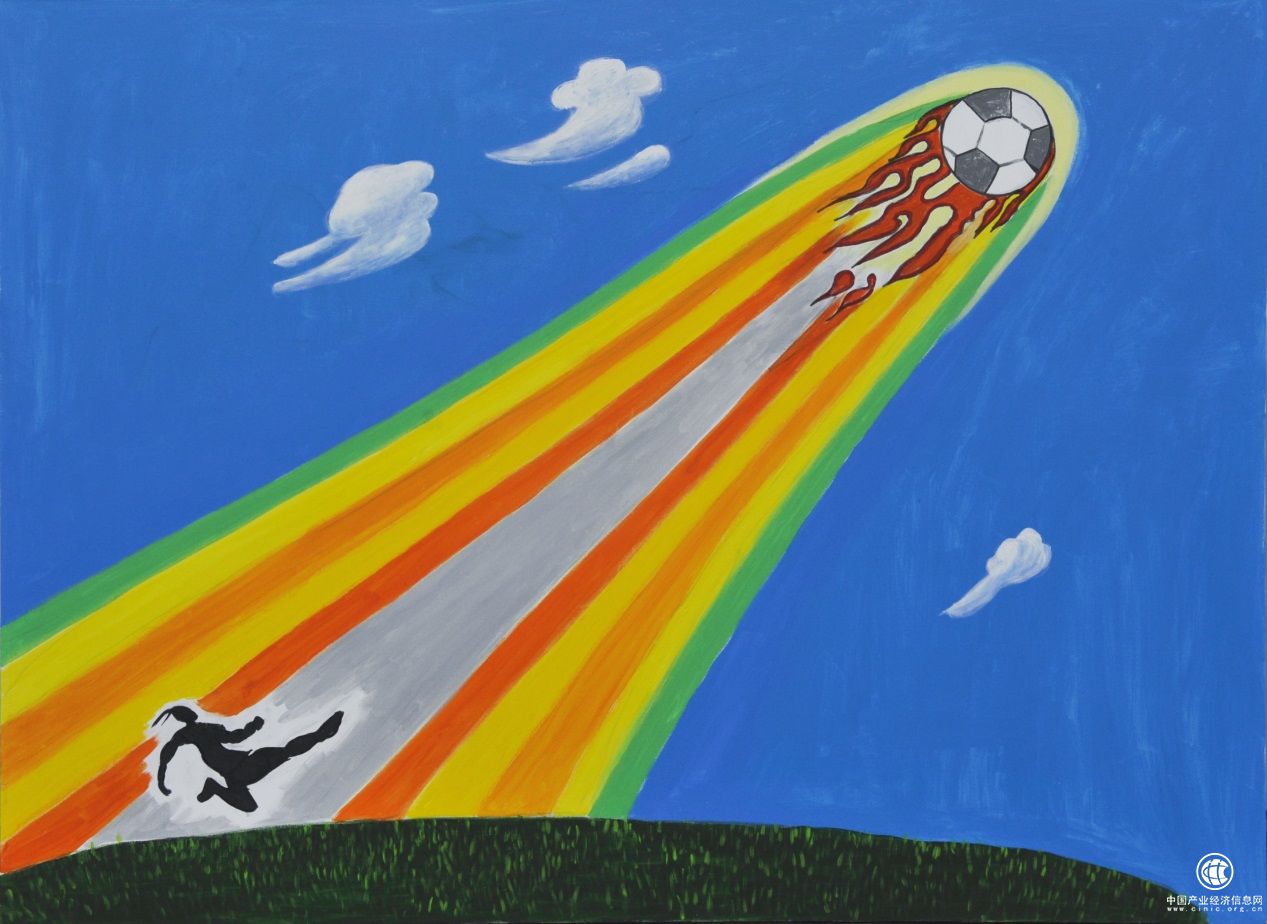 在藍天白云下,一個逆光的人影在球場上將一顆足球踢向了遠方,勢大力沉的一踢讓足球如火球一般飛出,拉出了一道炫麗的彩虹軌跡。畫中撲面而來的都是創(chuàng)作者對于中國足球最熱切的希望。逆著光只剩下剪影的踢球人并非普通的球員,而更像是遠古傳說中追著太陽奔跑的夸父,象征著對目標的執(zhí)著。飛向畫外的足球更像是告訴每個人,中國足球應(yīng)該著眼未來。中國足球能否在世界足壇騰飛,需要的是每一個中國人義無反顧的支持以及無限的熱愛。