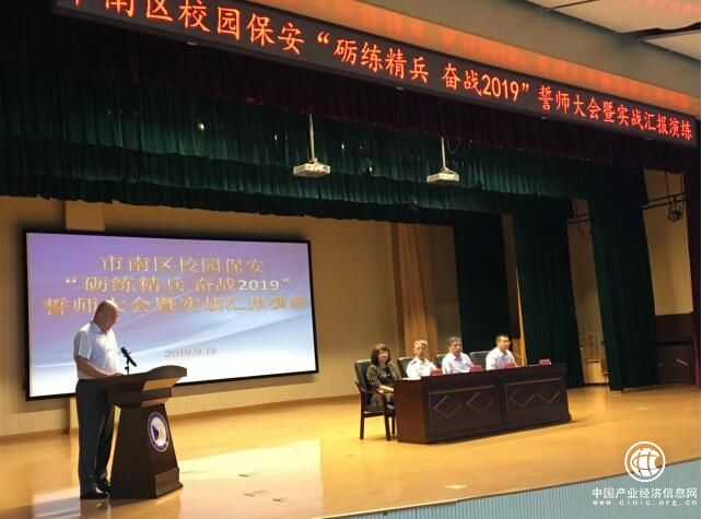 市南區(qū)委教育工委常務(wù)副書記、區(qū)教體局黨組書記、局長王軼強同志指出:要把維護校園安全穩(wěn)定作為事關(guān)萬千家庭幸福、事關(guān)社會和諧穩(wěn)定的大事抓緊抓實。堅決守好學(xué)校內(nèi)部安全這個主陣地,集中力量打好全區(qū)教育和體育系統(tǒng)“十大安全戰(zhàn)役”,持續(xù)深化“民警護學(xué)崗”活動,確保上放學(xué)高峰時間段校園門口2名民警護校崗執(zhí)勤,不斷推動校園安全工作水平的提檔升級。“開始”,隨著總指揮下達命令,市南區(qū)校園保安開展“礪練精兵 奮戰(zhàn)2019”實戰(zhàn)匯報演練正式開始,五家保安公司分別展示了“規(guī)定動作”、“對比動作”和“自選動作”,對校園安全不同突發(fā)情況進行模擬演練處置,保安隊員們用整裝揚旗、威武練兵的行動表達了堅決捍衛(wèi)校園安全安定的決心。