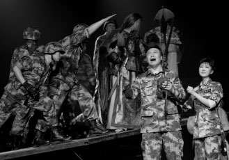 也正是由于這樣的三重結(jié)構(gòu)的戲劇構(gòu)建,縱橫捭闔,將歷史圖景與現(xiàn)實(shí)情境相互對(duì)映,相互交叉,相互滲透,相互融匯,使《尋找李大釗》具有了史詩(shī)戲劇的品格。這里的“史詩(shī)”不是贊美詞,也不是某個(gè)流派的術(shù)語(yǔ),更不是指臺(tái)上人物眾多,場(chǎng)面浩大,而是對(duì)《尋找李大釗》戲劇品格的定位——對(duì)歷史與現(xiàn)實(shí)全方位的審視,尖銳直面的剖析,嚴(yán)肅誠(chéng)實(shí)的探求,真摯熱忱的呼喚,描繪時(shí)代的滔滔巨流。