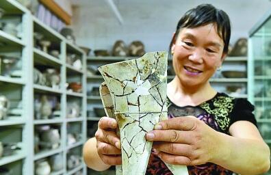 二里頭遺址女考古技工王叢苗在洛陽偃師二里頭考古隊展示一件修復(fù)后的文物。新華社發(fā)