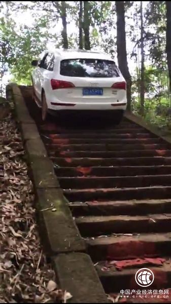 成都商報(bào)記者獲取的兩段視頻均為10秒,涉及川Q6599X和渝DW8053兩輛越野車。第一段視頻的主角是川Q6599X,一輛白色奧迪Q5越野車。視頻起點(diǎn)位于人行石梯道中間,鏡頭開始即聽到拍攝者嘻哈作樂的聲音,視頻可見奧迪車前方石梯步道完好無損,石徹臺(tái)階棱角分明,色彩陳舊;石梯四周修竹婆娑,綠樹成蔭,景致優(yōu)美,與石梯混然一體。