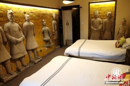 資料圖:民宿臥室內(nèi)的“兵馬俑”裝飾。近日,西安一家主打“兵馬俑”元素的民宿走紅,讓不少旅客感嘆如同居住在“秦始皇陵”。中新社記者張遠攝
