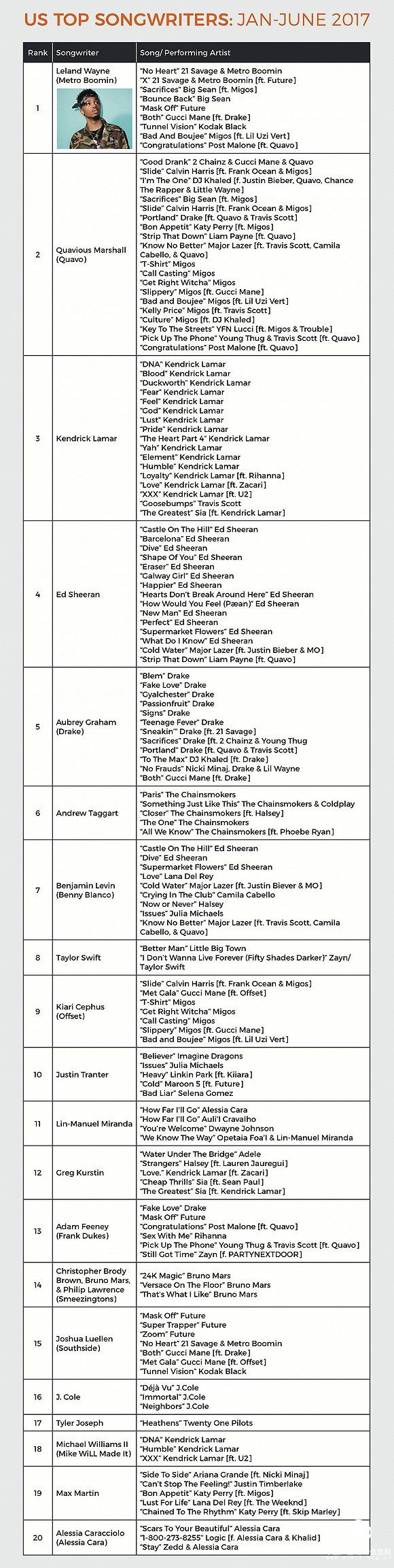 排名第二的QuaviousMarshall則是以量取勝,他一共有19首參與創(chuàng)作的歌曲進入了上半年的BillboardHot100排行榜!關(guān)鍵是,他同樣是一名HipHop創(chuàng)作者。實際上,在排行前五位的詞曲作者中,除了黃老板EdSheeran,其余四位都是HipHop藝人或制作人。