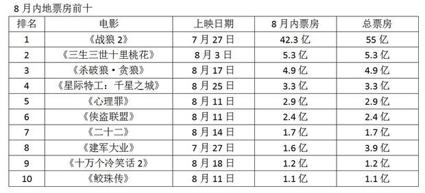 時(shí)光網(wǎng)訊 8月內(nèi)地票房突破73億,創(chuàng)造了新的內(nèi)地單月票房紀(jì)錄。