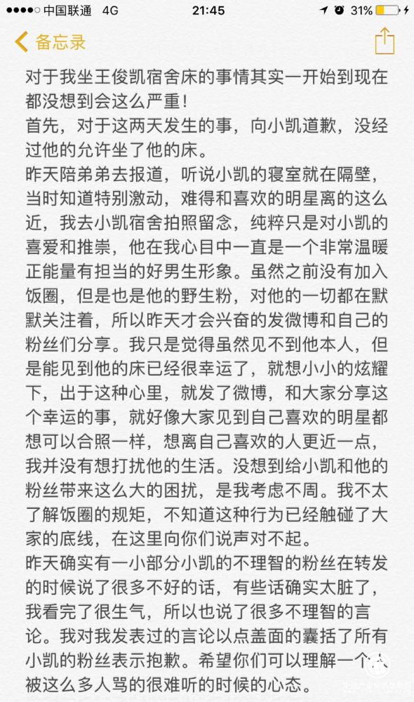 起初,網(wǎng)友批評該網(wǎng)紅蹭熱度,她在評論中還怒懟網(wǎng)友。事后,該網(wǎng)紅發(fā)布長文向王俊凱致歉,自稱王俊凱的野生粉,出于崇拜而與王俊凱宿舍拍照,曬到網(wǎng)上是要與網(wǎng)友分享幸運(yùn)。她也解釋說,最初不知道這件事會這么嚴(yán)重,不存在不禮貌行為,也沒有想要蹭熱度。