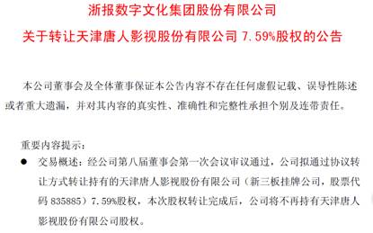 浙數(shù)文化轉(zhuǎn)讓所持唐人影視全部股權(quán)