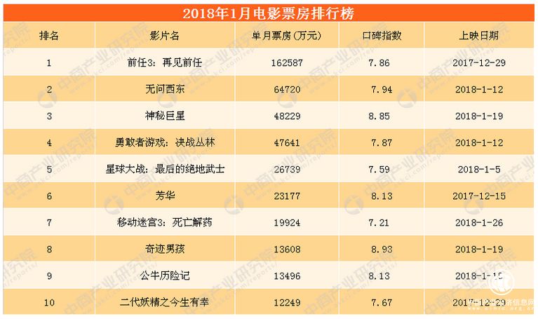 在一月份的電影市場(chǎng),國(guó)產(chǎn)大片表現(xiàn)不俗,《前任3》和《無(wú)問(wèn)西東》高居排行榜前兩位。此外,還有3部國(guó)產(chǎn)片票房過(guò)億。