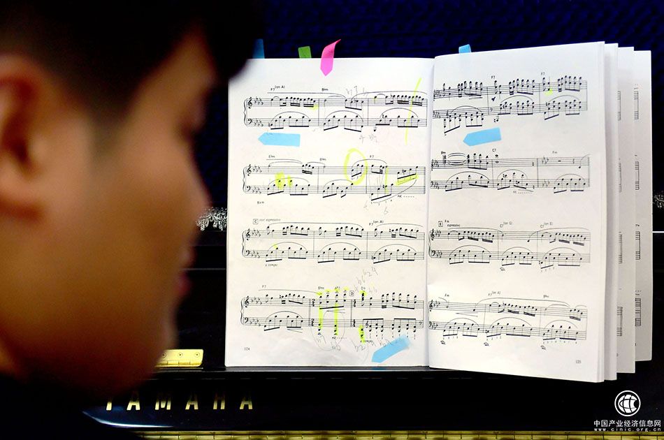 張?jiān)ぷ阡撉偾把芯恐僮V,他所用的琴譜上用各色彩筆和標(biāo)簽紙作著各種標(biāo)記。