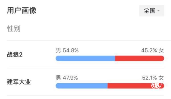 貓眼專業(yè)版上,對(duì)于《戰(zhàn)狼2》和《建軍大業(yè)》觀眾性別畫像,《戰(zhàn)狼2》超過(guò)五成是男性觀眾,而《建軍大業(yè)》則超過(guò)五成為女性觀眾。
