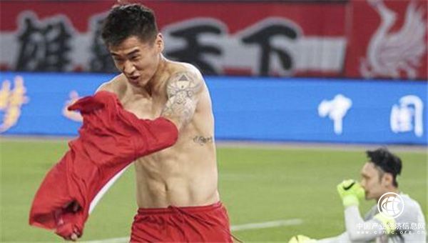 上海U23球員韋世豪梅開二度,脫衣慶祝。