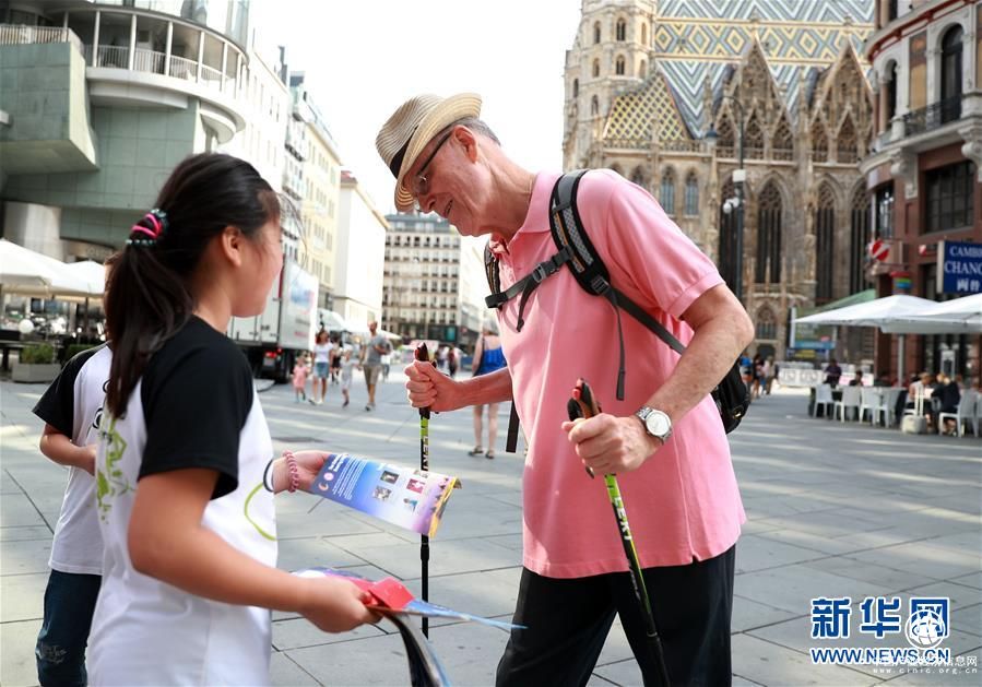 8月11日,在奧地利維也納市中心的商業(yè)步行街上,一名“熊貓小記者”向一名美國游客遞上宣傳畫冊。