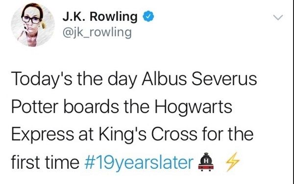J·K·羅琳當天也發(fā)表推文:“今天是阿不思·西弗勒斯·波特第一次在國王十字車站,登上霍格沃茨特快列車的日子。”