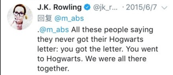 實際上,每個哈迷都是得到認可的霍格沃茨畢業(yè)生:“其實你們早就收到了那封錄取信,你們?nèi)际腔舾裎执牡膶W(xué)生,我們共同度過了霍格沃茨的歲月。”