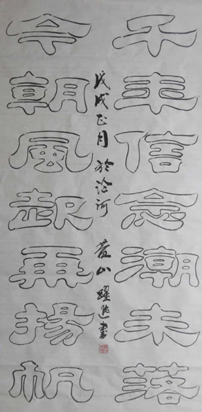 凌躍進(jìn),男,愛(ài)好詩(shī)、書(shū)、聯(lián)、畫(huà),尤其是書(shū)法。獨(dú)忠隸書(shū),走向社會(huì)后,在農(nóng)閑和打工閑空時(shí),苦練雙勾隸書(shū),榕多家隸書(shū)之精髓,創(chuàng)雙勾獨(dú)自成一幟--豆葉雙勾隸書(shū)。