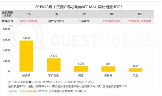 值得關(guān)注的是,QuestMobile的報(bào)告顯示:拼多多5880萬的同比凈增規(guī)模,甚至大于綜合電商整體5356萬的同比凈增規(guī)模。這表明,拼多多有相當(dāng)比例的凈增用戶,為行業(yè)既有用戶,拼多多在持續(xù)拓展新用戶的同時(shí),也對(duì)行業(yè)整體存量用戶實(shí)現(xiàn)了極高的滲透率,在下沉市場(chǎng)的競(jìng)爭(zhēng)中,拼多多的取代效應(yīng)愈發(fā)明顯。