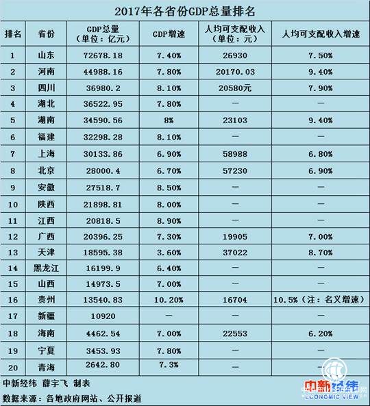 進(jìn)入1月中下旬,全國(guó)多個(gè)省份開(kāi)始公布各自“年報(bào)”。中新經(jīng)緯客戶端不完全統(tǒng)計(jì),截至23日,北京、上海、天津、山東、河南、陜西、山西、安徽、福建、湖南、湖北、廣西、貴州、四川、黑龍江、江西、海南、新疆、寧夏、青海20個(gè)省份公布了2017年主要的經(jīng)濟(jì)數(shù)據(jù)。