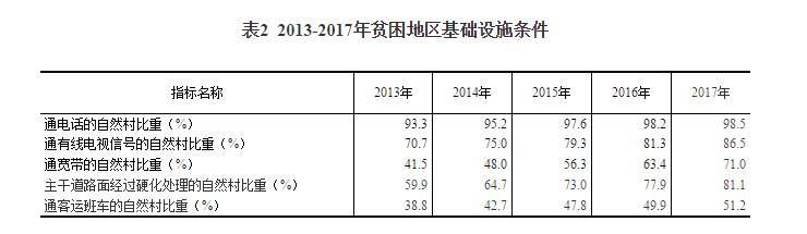 基礎(chǔ)設(shè)施條件不斷完善。截至2017年末,貧困地區(qū)通電的自然村接近全覆蓋;通電話的自然村比重達(dá)到98.5%,比2012年提高5.2個(gè)百分點(diǎn);通有線電視信號(hào)的自然村比重為86.5%,比2012年提高17.5個(gè)百分點(diǎn);通寬帶的自然村比重為71.0%,比2012年提高32.7個(gè)百分點(diǎn)。2017年貧困地區(qū)村內(nèi)主干道路面經(jīng)過(guò)硬化處理的自然村比重為81.1%,比2013年提高21.2個(gè)百分點(diǎn);通客運(yùn)班車的自然村比重為51.2%,比2013年提高12.4個(gè)百分點(diǎn)。