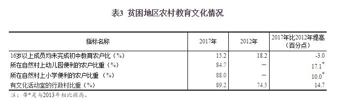 教育文化狀況明顯改善。2017年,貧困地區(qū)農(nóng)村居民16歲以上家庭成員均未完成初中教育的農(nóng)戶比重為15.2%,比2012年下降3.0個(gè)百分點(diǎn);84.7%的農(nóng)戶所在自然村上幼兒園便利,88.0%的農(nóng)戶所在自然村上小學(xué)便利,分別比2013年提高17.1和10.0個(gè)百分點(diǎn);有文化活動(dòng)室的行政村比重為89.2%,比2012年提高14.7個(gè)百分點(diǎn)。