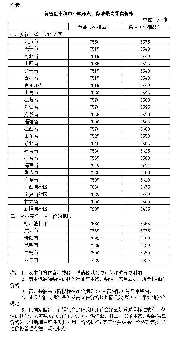 根據(jù)近期國際市場油價變化情況,按照現(xiàn)行成品油價格形成機制,自2017年7月21日24時起,國內汽、柴油價格(標準品,下同)每噸均提高75元。調整后,各?。▍^(qū)、市)和中心城市汽、柴油最高零售價格見附表。相關價格聯(lián)動及補貼政策按現(xiàn)行規(guī)定執(zhí)行。