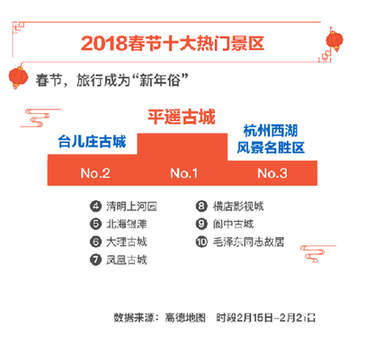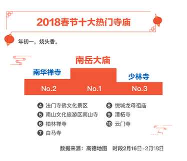 數(shù)據(jù)顯示,2018年春節(jié)前夕駕車去往廣州塔、磁器口、鳳凰古城的導(dǎo)航用戶最高,節(jié)中去往平遙古鎮(zhèn)、臺兒莊古城、杭州西湖風(fēng)景名勝區(qū)的導(dǎo)航用戶最高。而年初一到年初三,衡陽南岳大廟、韶關(guān)南華禪寺、鄭州少林寺成為熱門祈福寺廟前三甲。