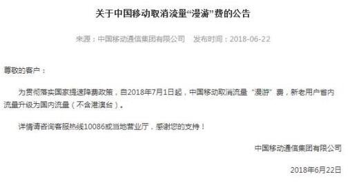 中國移動22日在官網(wǎng)發(fā)布關(guān)于取消流量“漫游”費的公告,公告稱,自2018年7月1日起,中國移動取消流量“漫游”費,新老用戶省內(nèi)流量升級為國內(nèi)流量(不含港澳臺)。