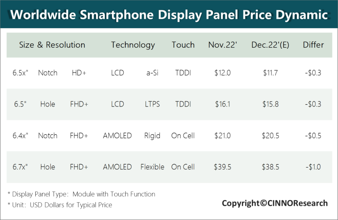 CINNO Research 預(yù)測,在需求沒有明顯利好因素的情況下,智能手機(jī)面板價(jià)格將持續(xù)走低,2022 年 12 月和 2023 年 1 月 a-Si / LTPS 面板價(jià)格將每月下降 0.3 美元;剛性 AMOLED 面板價(jià)格將繼續(xù)下降 0.5 美元;柔性 AMOLED 面板價(jià)格或?qū)⑾陆?1 美元。