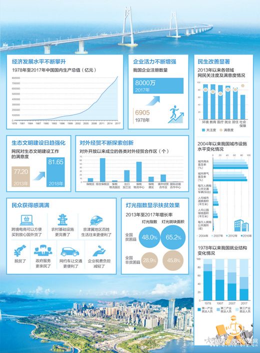 輿論對(duì)2018年國務(wù)院機(jī)構(gòu)改革正面評(píng)價(jià)占比95.81%;企業(yè)注冊(cè)數(shù)量由1978年的6905家增加到2017年的8000萬家;社會(huì)保障領(lǐng)域民眾獲得感最強(qiáng)、滿意度指數(shù)達(dá)96.31……國家信息中心今日發(fā)布的《大數(shù)據(jù)看改革開放新時(shí)代》一書,包括多份報(bào)告,匯聚40億條數(shù)據(jù),通過大數(shù)據(jù)分析技術(shù)展現(xiàn)了改革開放以來各領(lǐng)域取得的輝煌成就。