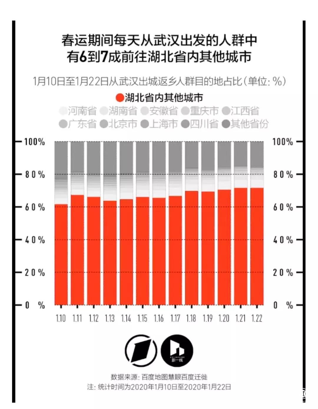 第一財(cái)經(jīng)·新一線城市研究所引用百度地圖慧眼的遷徙大數(shù)據(jù)也顯示,1月10日至1月22日春運(yùn)期間(武漢封城之前),每天從武漢出發(fā)的人群中有6至7成的人前往了湖北省內(nèi)的其他城市,其次是河南省、湖南省、安徽省、重慶市、江西省。