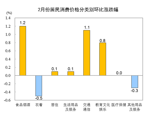 2月份,全國居民消費(fèi)價(jià)格環(huán)比上漲0.6%。其中,城市上漲0.6%,農(nóng)村上漲0.4%;食品價(jià)格上漲1.6%,非食品價(jià)格上漲0.4%;消費(fèi)品價(jià)格上漲0.7%,服務(wù)價(jià)格上漲0.4%。