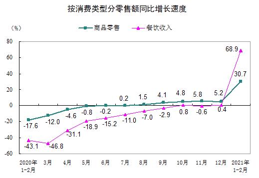 按消費(fèi)類型分,1—2月份,商品零售62651億元,同比增長30.7%,兩年平均增長3.8%;餐飲收入7085億元,同比增長68.9%,兩年平均下降2.0%。