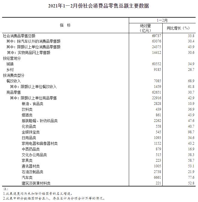 按經(jīng)營單位所在地分,1—2月份,城鎮(zhèn)消費(fèi)品零售額60552億元,同比增長34.9%,兩年平均增長3.4%;鄉(xiāng)村消費(fèi)品零售額9185億元,同比增長26.7%,兩年平均增長1.3%。