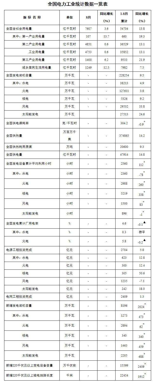 注:1.全社會用電量為全口徑數(shù)據(jù),全國供電量為調(diào)度口徑數(shù)據(jù)。2.“同比增長”列中,標(biāo)*的指標(biāo)為絕對量;標(biāo)▲的指標(biāo)為百分點(diǎn)。