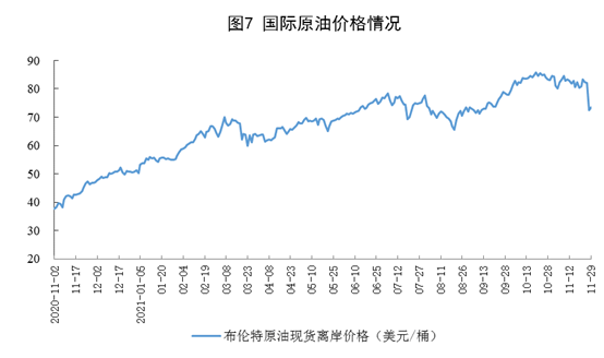 原油進(jìn)口降幅收窄,國際原油價(jià)格下跌。11月份,進(jìn)口原油4179萬噸,同比下降7.9%,降幅比上月收窄3.1個(gè)百分點(diǎn);1—11月份,進(jìn)口原油46684萬噸,同比下降7.3%。11月29日,布倫特原油現(xiàn)貨離岸價(jià)格為73.3美元/桶,比10月29日下跌11.7%。