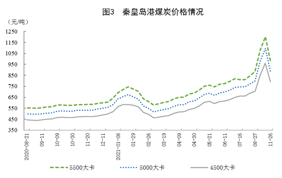 11月26日,秦皇島港5500大卡、5000大卡和4500大卡動(dòng)力煤綜合交易價(jià)格分別為每噸986元、891元和792元,比10月29日分別回落216元、205元和169元。