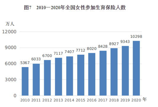 1.女性生育保險(xiǎn)[9]覆蓋面明顯擴(kuò)大?!毒V要》實(shí)施期間,覆蓋全體婦女的生育保障制度體系逐步建立,生育保險(xiǎn)和職工醫(yī)療保險(xiǎn)合并實(shí)施全面推進(jìn),基金共濟(jì)能力明顯增強(qiáng);未就業(yè)婦女生育醫(yī)療費(fèi)用通過城鄉(xiāng)居民醫(yī)療保險(xiǎn)解決政策的實(shí)施,實(shí)現(xiàn)了生育醫(yī)療費(fèi)用保障的全覆蓋。2020年末,女性參加生育保險(xiǎn)的人數(shù)為1.03億人,比2010年增加4931萬人,是2010年的1.9倍(見圖7)。
