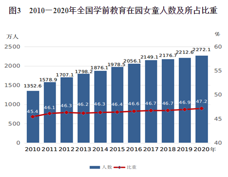 1.女童平等接受學(xué)前教育得到切實(shí)保障?!毒V要》實(shí)施以來,我國(guó)連續(xù)實(shí)施三期學(xué)前教育行動(dòng)計(jì)劃,多種形式增加學(xué)前教育資源,切實(shí)保障女童平等接受學(xué)前教育的權(quán)益。2020年,全國(guó)共有學(xué)前教育(包括幼兒園和附設(shè)幼兒班)在園女童2272.1萬人,比2010年增加919.5萬人,增長(zhǎng)68%,增速比全部在園兒童高6.1個(gè)百分點(diǎn);接受學(xué)前教育的女童所占比重為47.2%,比2010年提高1.7個(gè)百分點(diǎn)(見圖3)。2020年,全國(guó)學(xué)前教育毛入園率為85.2%,遠(yuǎn)高于《綱要》“達(dá)到70%”的目標(biāo)。