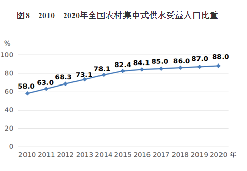 3.農(nóng)村人居環(huán)境持續(xù)改善。2018年,中央農(nóng)辦等18個(gè)部門聯(lián)合印發(fā)《農(nóng)村人居環(huán)境整治村莊清潔行動(dòng)方案》,啟動(dòng)并實(shí)施村莊清潔行動(dòng),目前農(nóng)村人居環(huán)境整治三年行動(dòng)方案目標(biāo)任務(wù)全面完成。全國(guó)95%以上的村莊開展了清潔行動(dòng),村民的環(huán)境與健康意識(shí)進(jìn)一步增強(qiáng),村莊環(huán)境趨于干凈整潔。2020年,農(nóng)村集中式供水受益人口比重達(dá)到88.0%,比2010年提高30個(gè)百分點(diǎn),實(shí)現(xiàn)《綱要》“達(dá)到85%左右”的目標(biāo)(見圖8)。