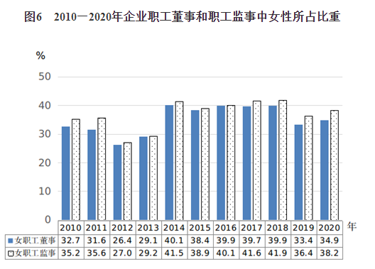 2.女性參與企業(yè)經(jīng)營(yíng)管理更加深入?!毒V要》實(shí)施以來,我國(guó)經(jīng)濟(jì)社會(huì)加快發(fā)展,人們思想觀念不斷更新,公開、透明、擇優(yōu)的選拔任用機(jī)制持續(xù)完善,女性在企業(yè)管理中占據(jù)著越來越重要的地位。2020年,企業(yè)職工董事和職工監(jiān)事中女性比重分別為34.9%和38.2%(見圖6),分別比2010年提高2.2個(gè)和3.0個(gè)百分點(diǎn)。企業(yè)職工代表大會(huì)中女性代表比重[8]為30.2%,比2010年提高1.2個(gè)百分點(diǎn)。