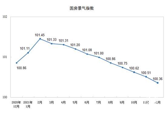 2021年12月份,房地產(chǎn)開發(fā)景氣指數(shù)(簡稱“國房景氣指數(shù)”)為100.36。
